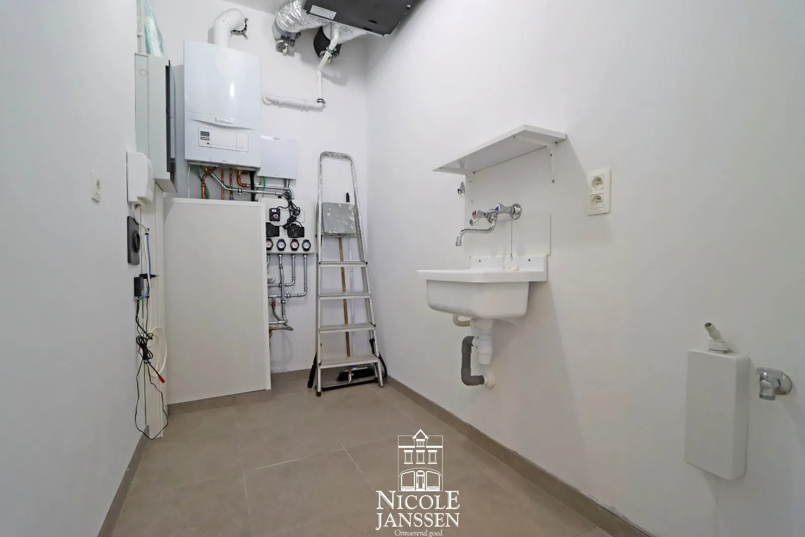 -- Gelijkvloers: inkomhal, gastentoilet, woonkamer met open keuken, berging/wasplaats, twee slaapkamers, badkamer