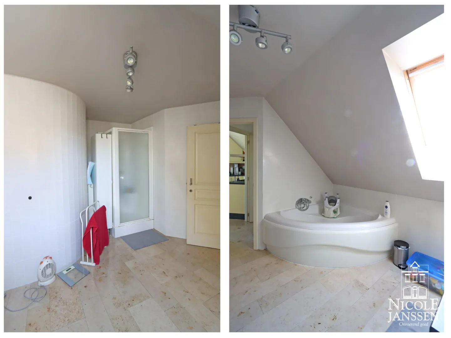 - Volledig betegelde badkamer met hoekbad, enkele wastafel in badkamermeubel met grote spiegel en douche