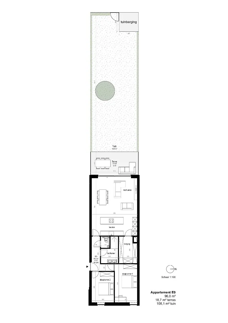 - Tuin (108,10m²) + terras (18,7m²)