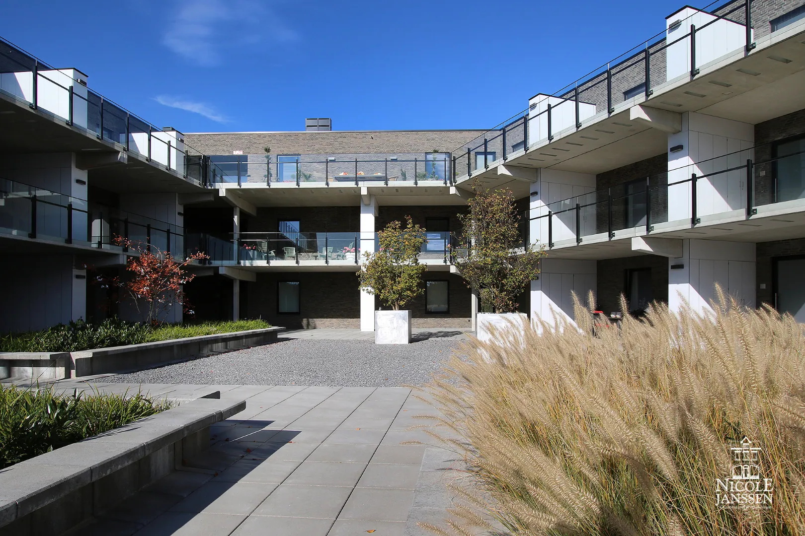 De ruime en lichte appartementen, alle met terras, worden ontsloten via brede galerijen die uitkijken op een binnentuin op het dak van de winkel. De tuin, het bijhorende zonneterras en de aanpalende ontmoetingsruimte zijn alleen toegankelijk voor bewoners en hun bezoekers. Een ideale plek voor een gezellige babbel of een spelletje kaarten of petanque.
