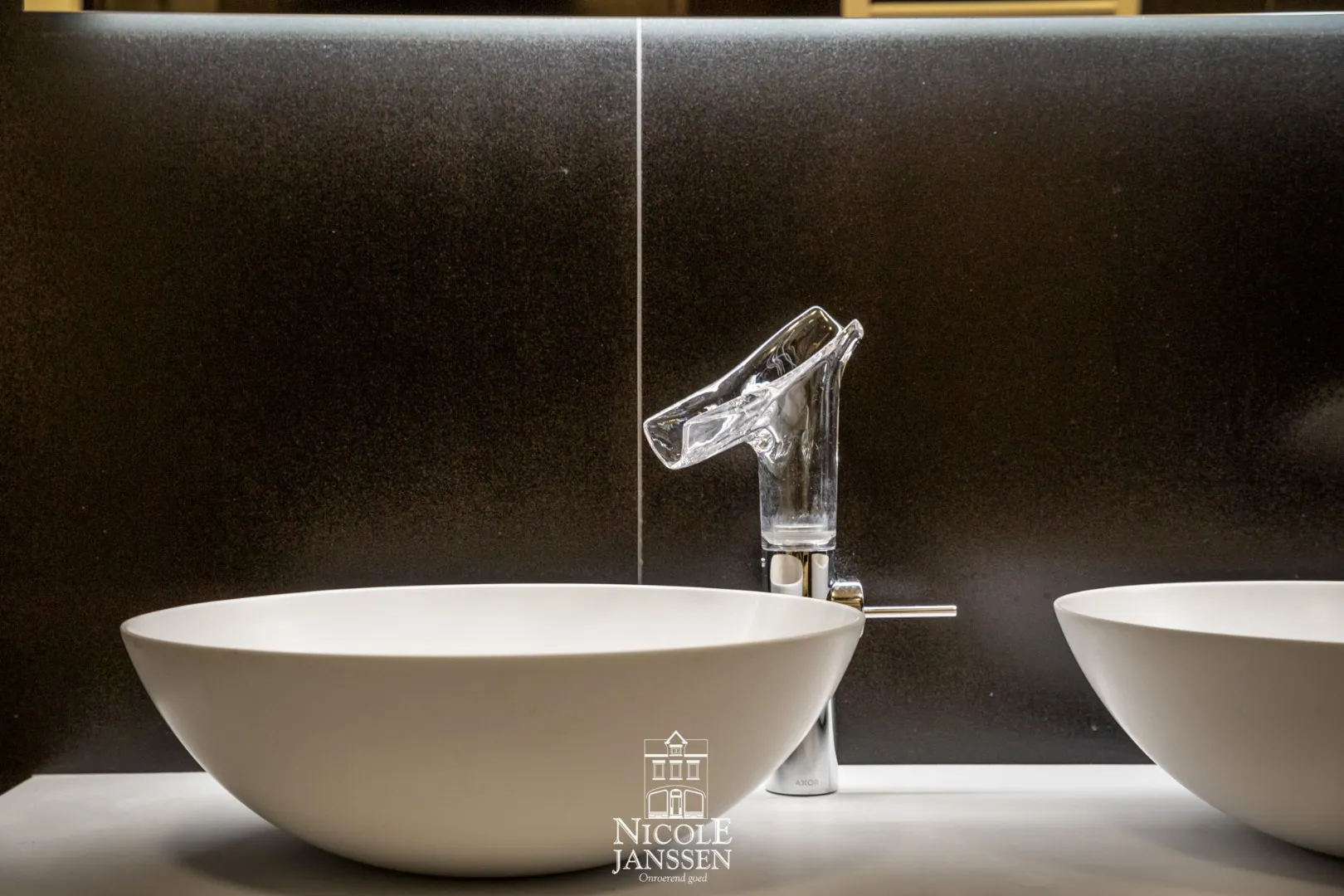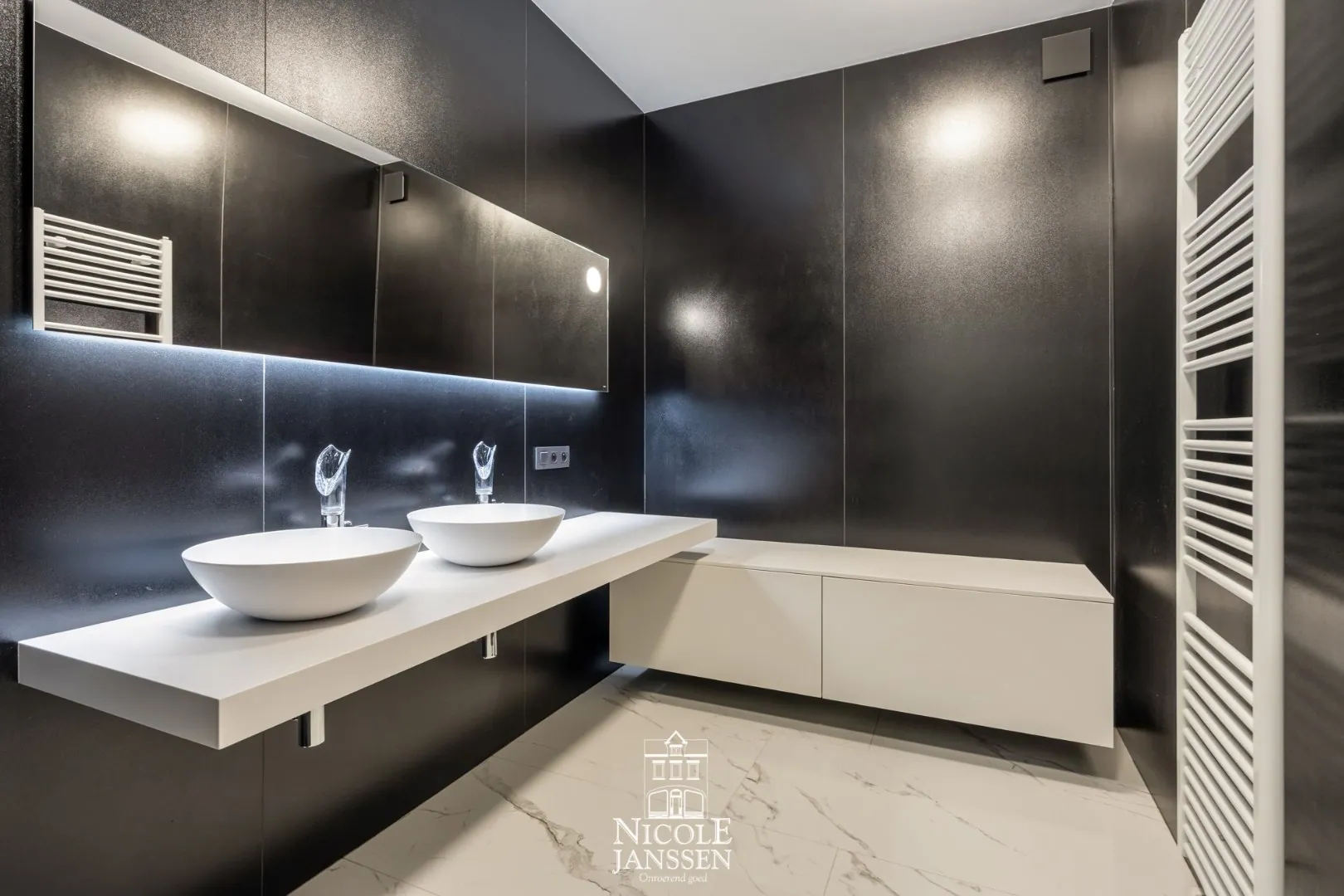 - Badkamer met inloopdouche en dubbele lavabo op stijlvol badkamermeubel