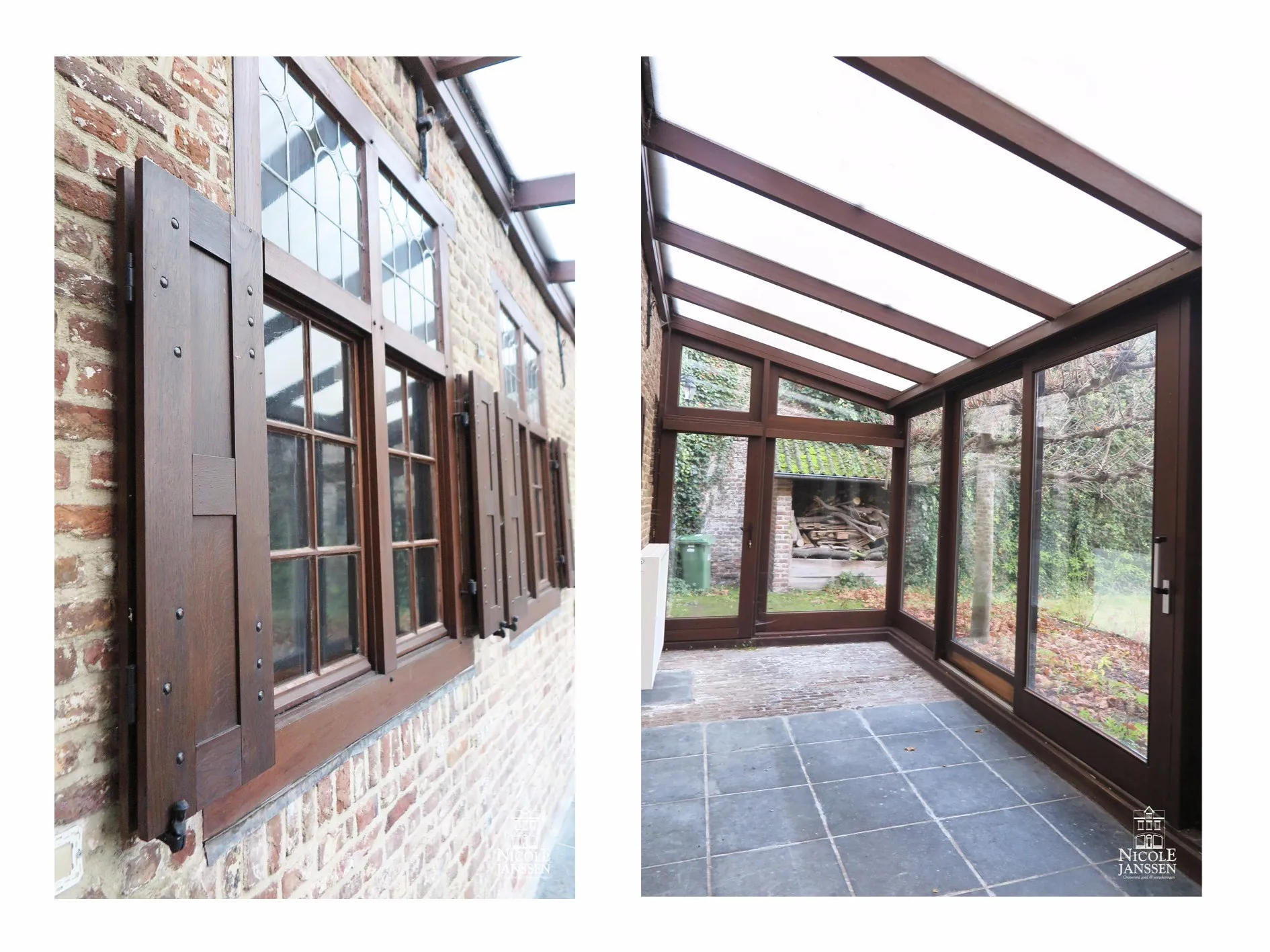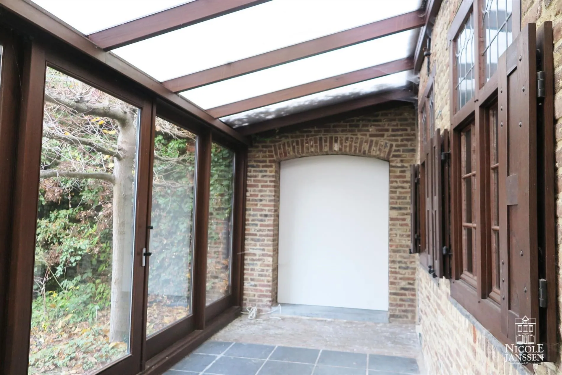 - Aan de achterzijde is er een zonnige tuinkamer/veranda met schuifraam