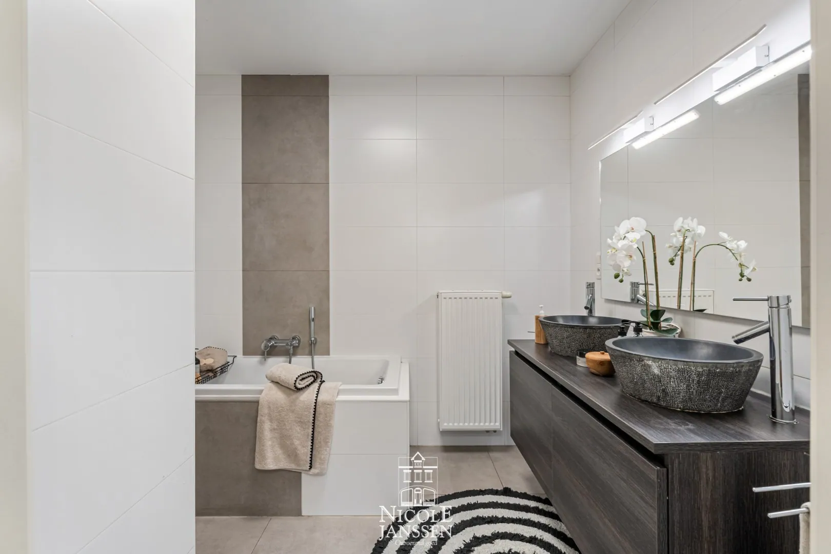 - Betegelde badkamer met ligbad, douche en dubbele lavabo op badkamermeubel