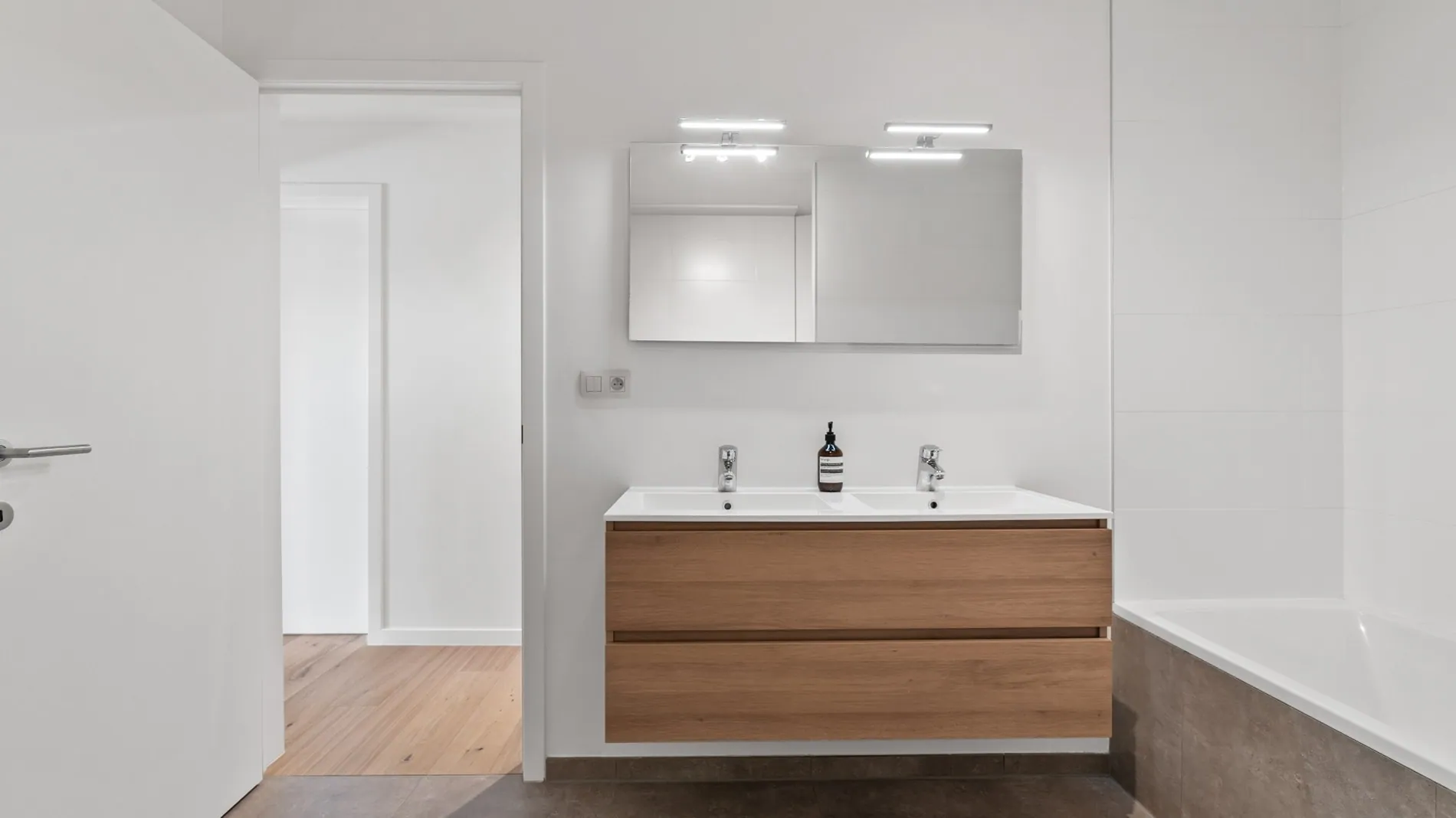 - Betegelde badkamer met inloopdouche, toilet, ligbad en dubbele wastafel in badkamermeubel