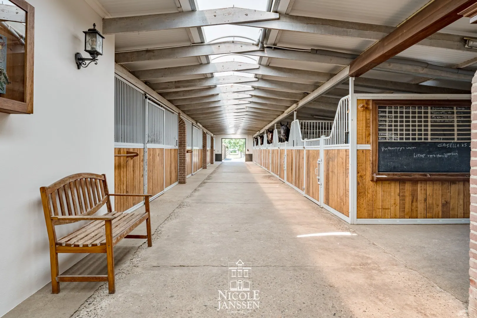 - Paardenboxen met betonnen vloer, gegalvaniseerd metalen frame en hardhouten panelen, uitgerust met voederbakken, verwarmde drinkbakken en een vliegwerende vernevelingsinstallatie