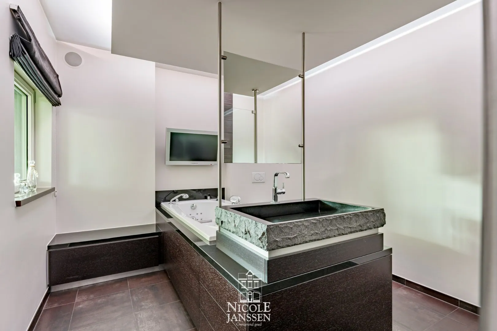 - Badkamer met ligbad met jetstreams, inloopdouche en wastafel