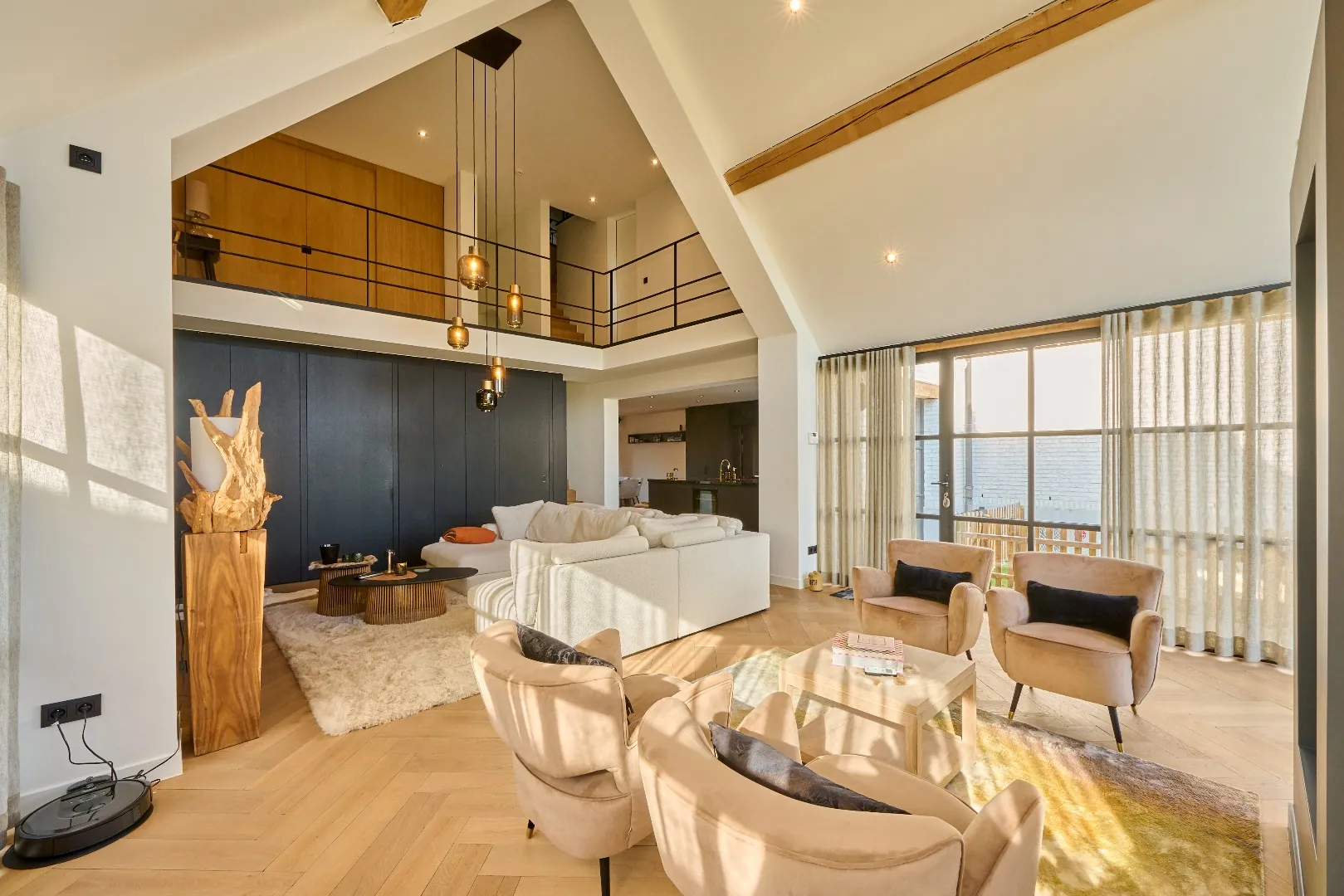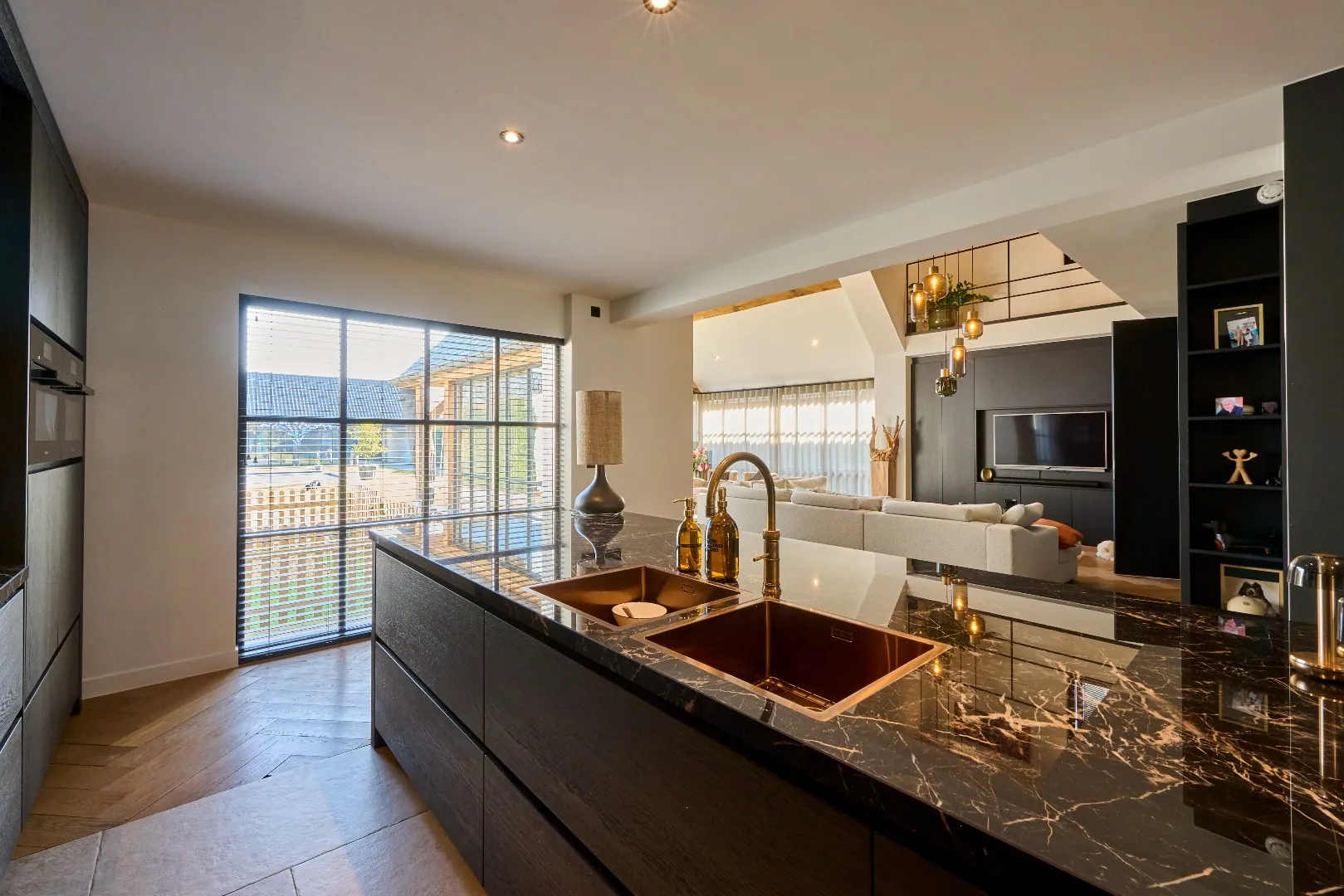 - De keuken staat in directe verbinding met de open leefruimte met hoge plafonds en visgraatparket