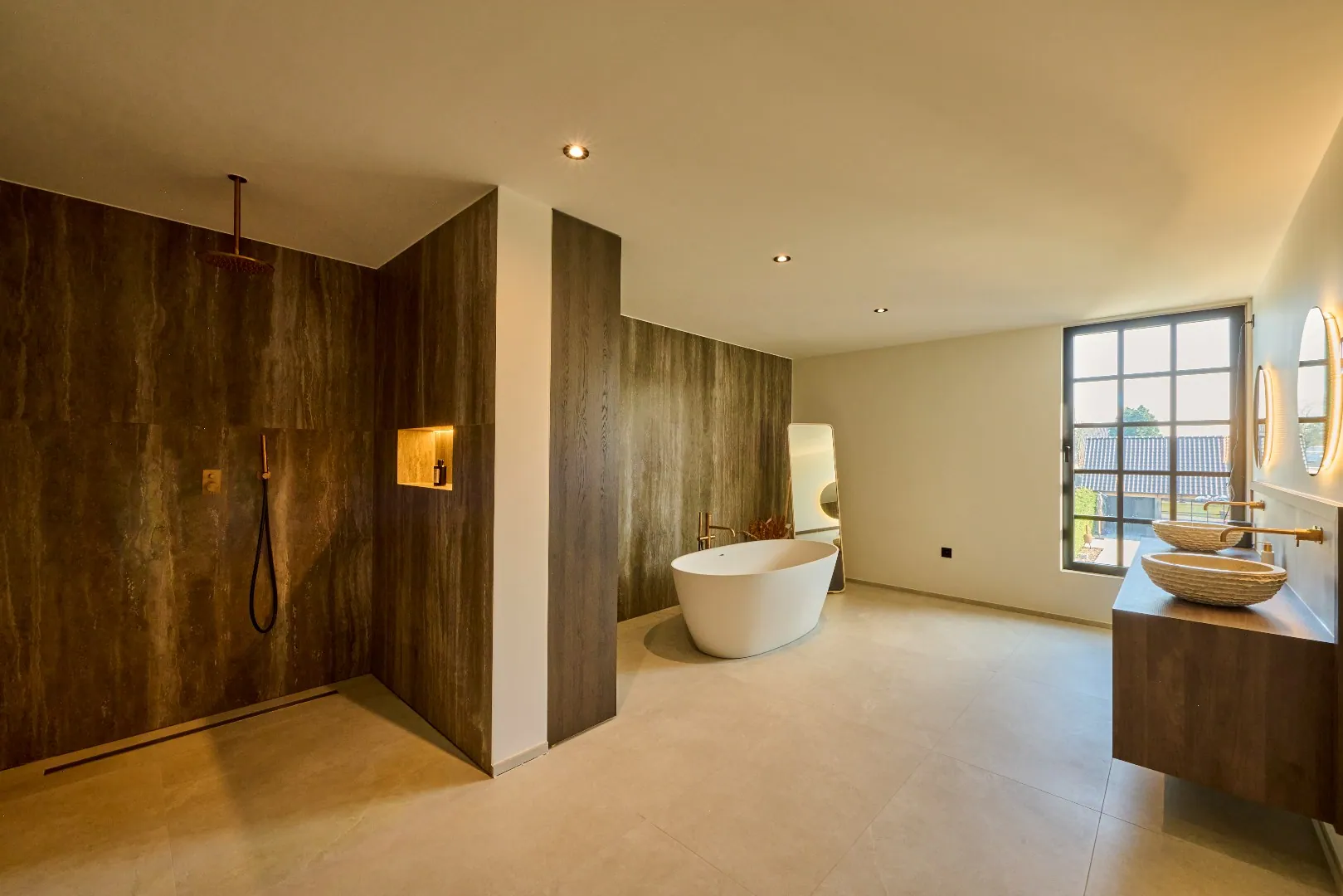 - Badkamer met inloopdouche, losstaand bad en dubbele lavabo verwerkt in een elegant badkamermeubel
