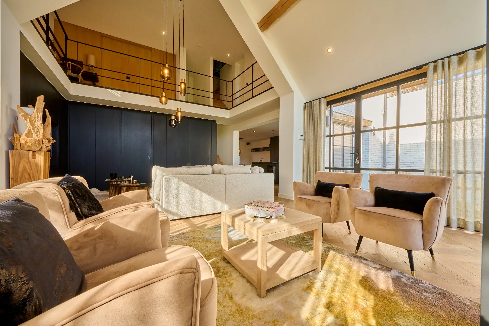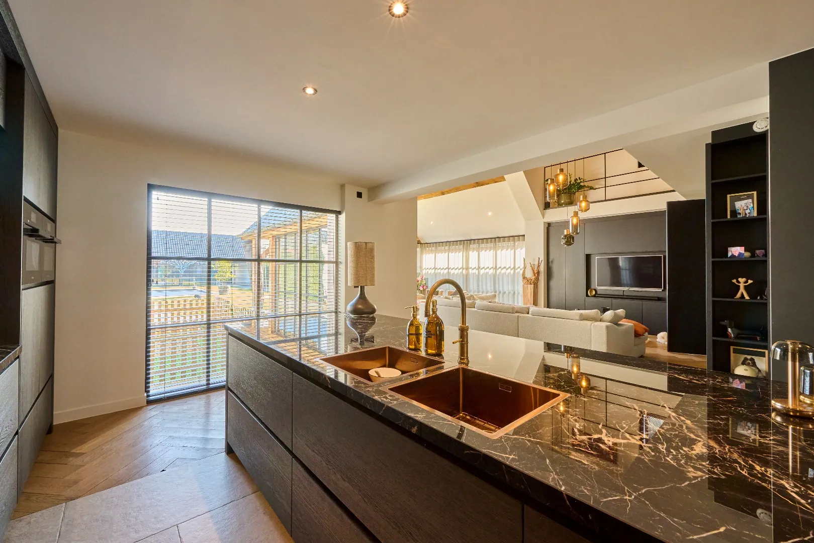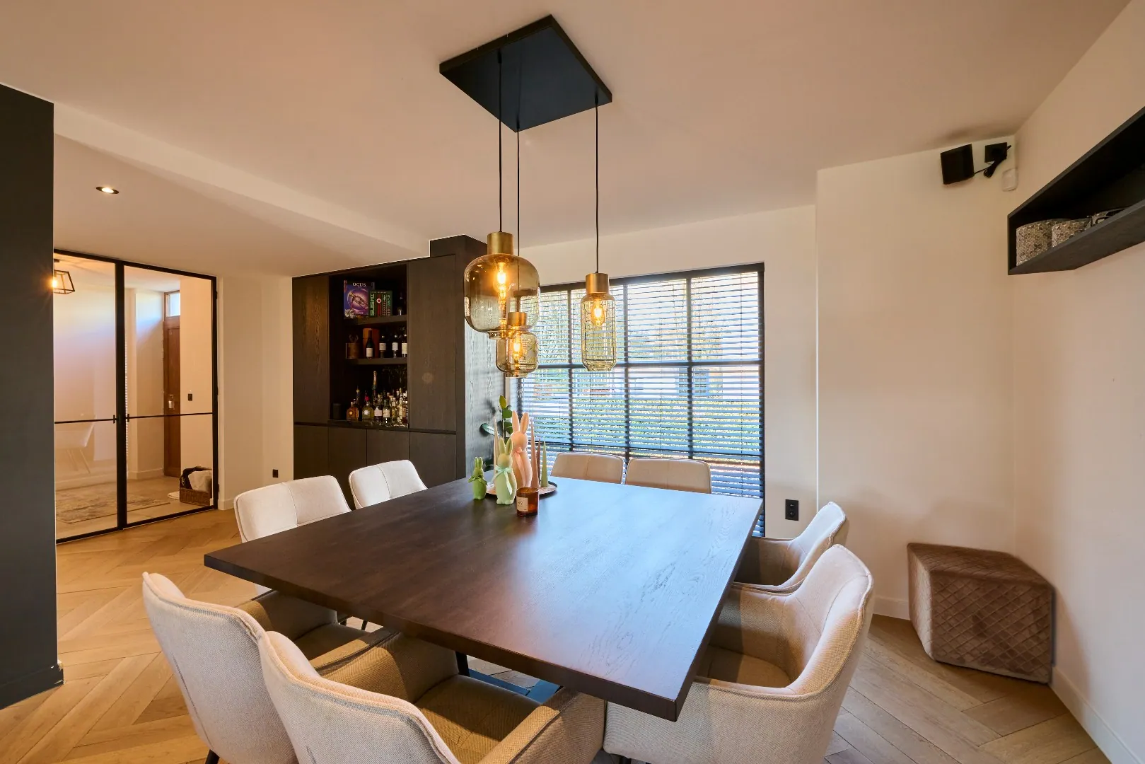 - Via de glazen wand bereik je de luxueus ingerichte open keuken met hoogwaardige afwerking en een aparte, gezellige eethoek