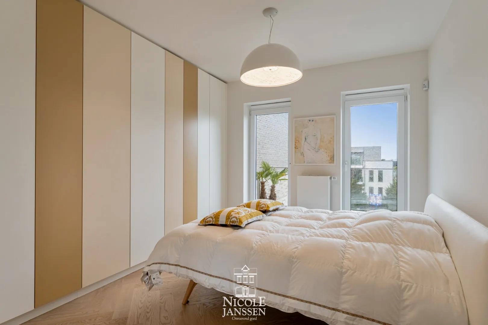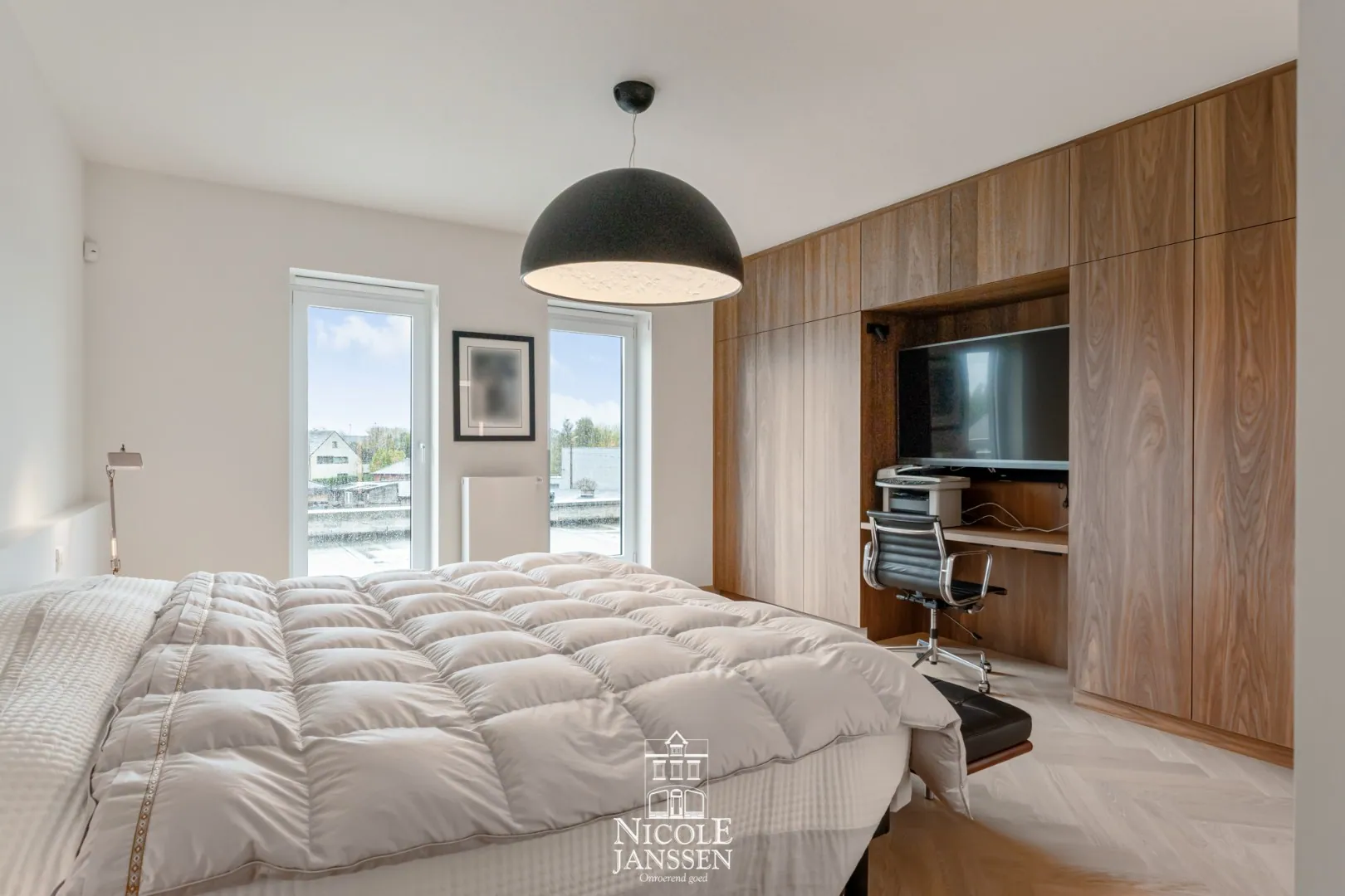 - De master bedroom is ruim en elegant ingericht met een op maat gemaakte ingebouwde kastenwand