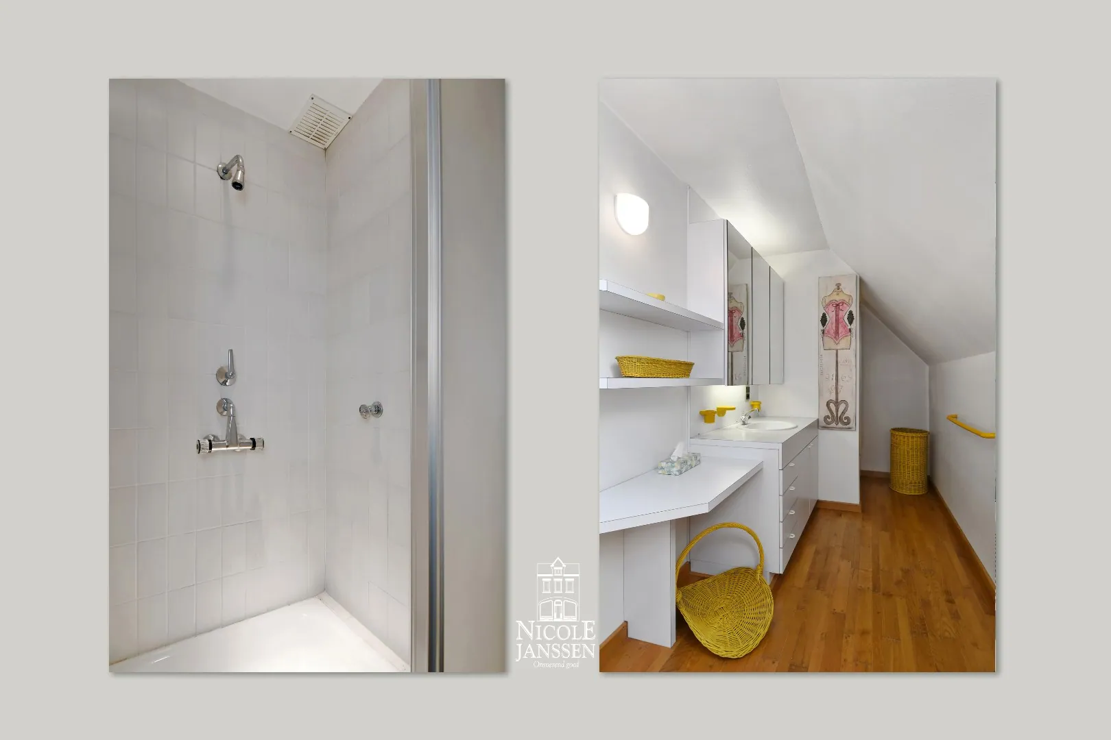 - Badkamer met douche en enkele lavabo in badkamermeubel