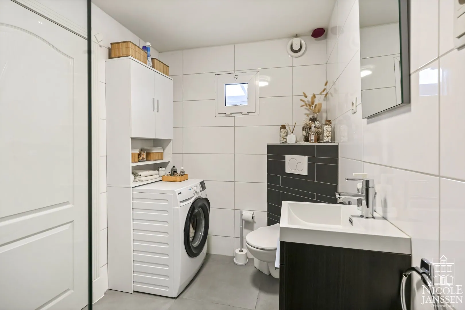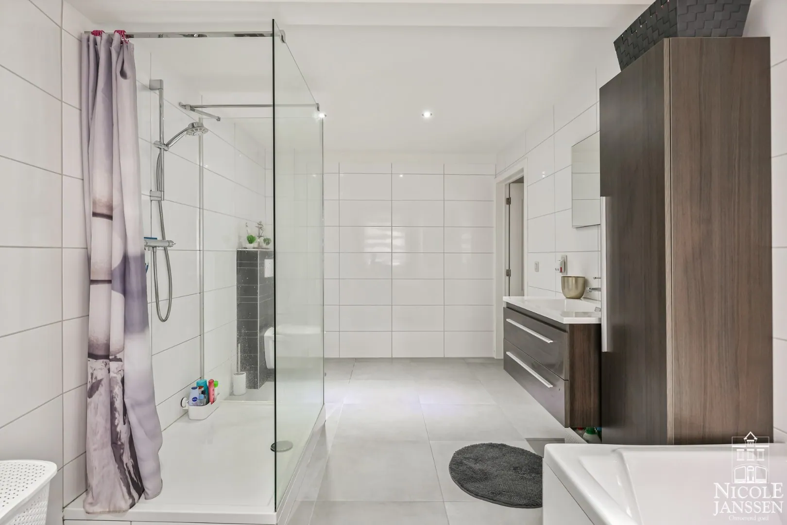 - Volledig betegelde badkamer met inloopdouche, toilet, en wastafel