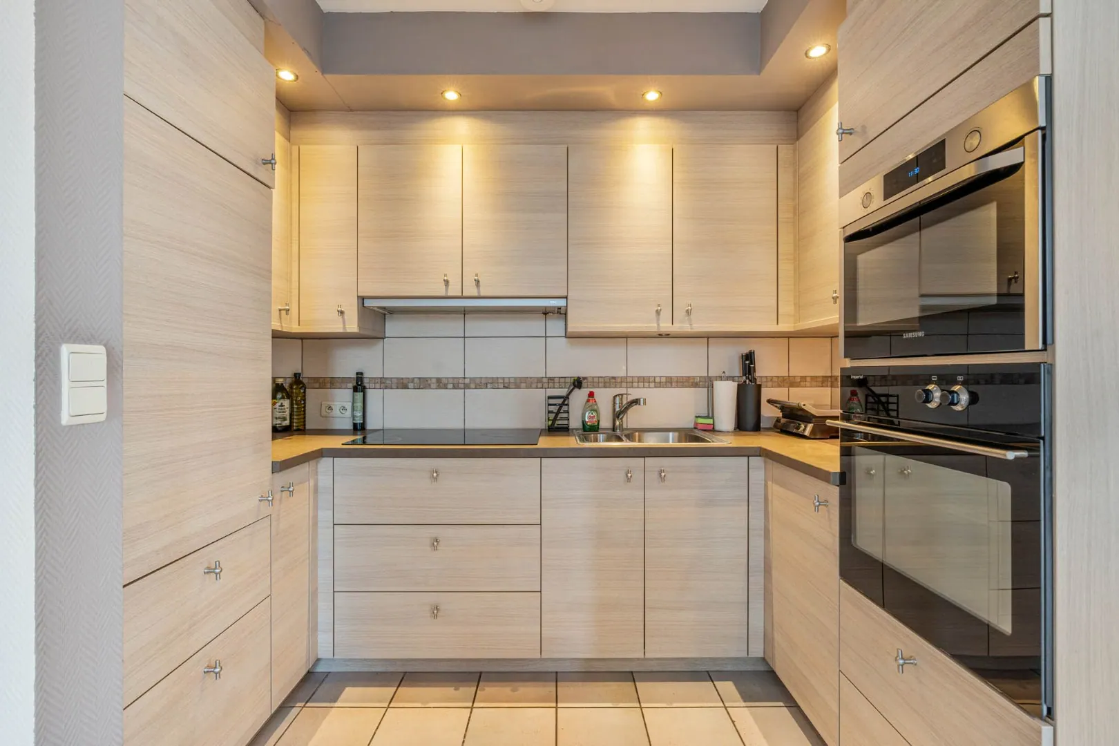 - Keuken met koelkast, oven, microgolfoven, kookplaat en afzuigkap
