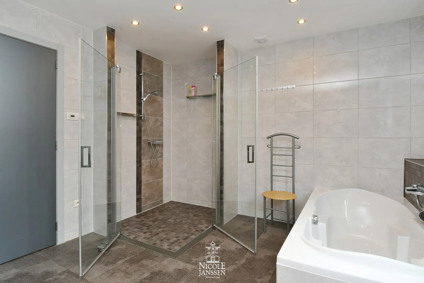 - Volledig betegelde badkamer voorzien van grote douche, ligbad en dubbele wastafel