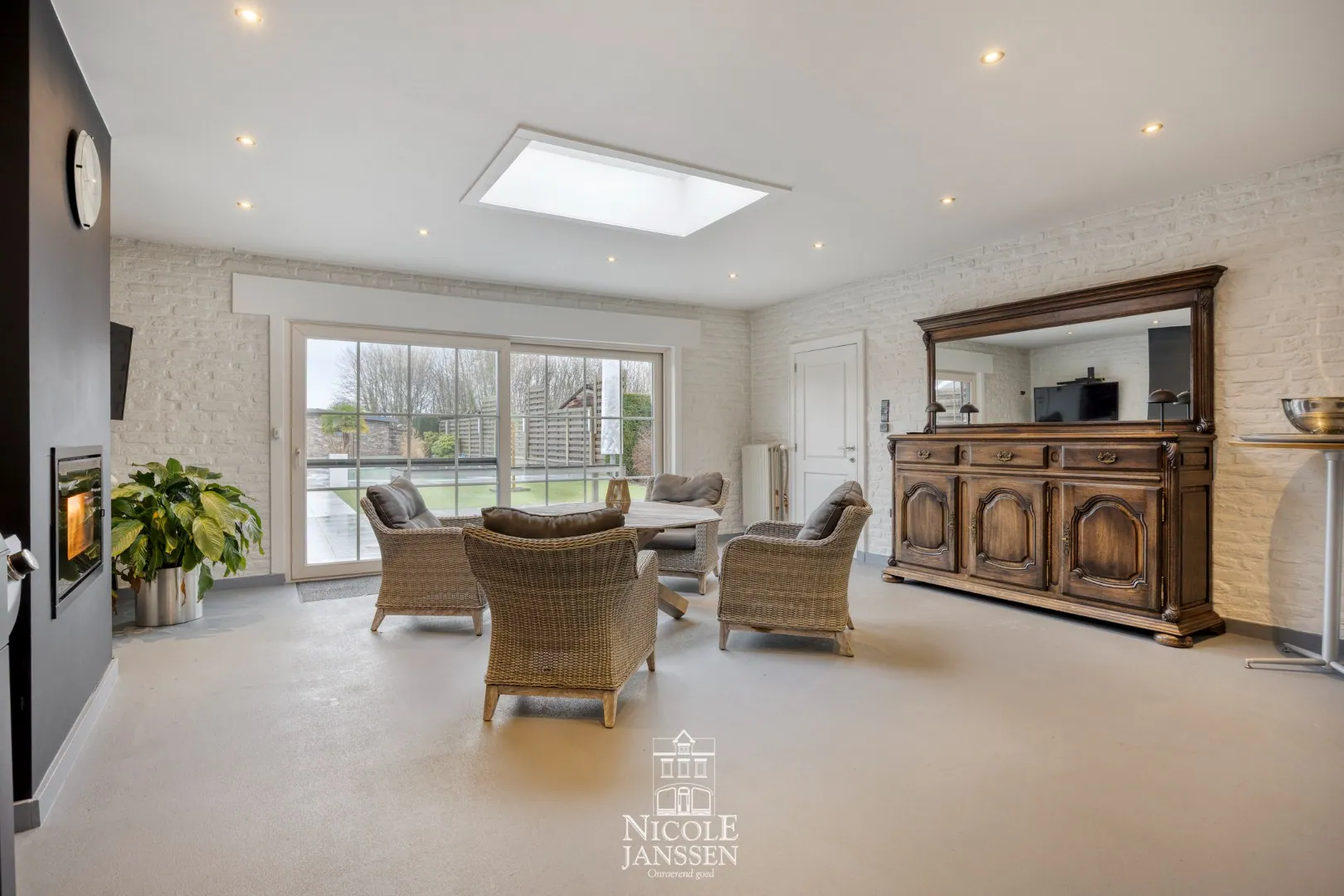 - Betegeld terras aan de achterzijde van de woning met zicht op de tuin en verwarmd zwembad