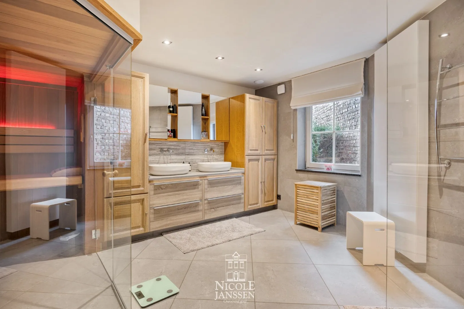 - Badkamer voorzien van dubbele wastafel in mooi badkamermeubel, inloopdouche en sauna
