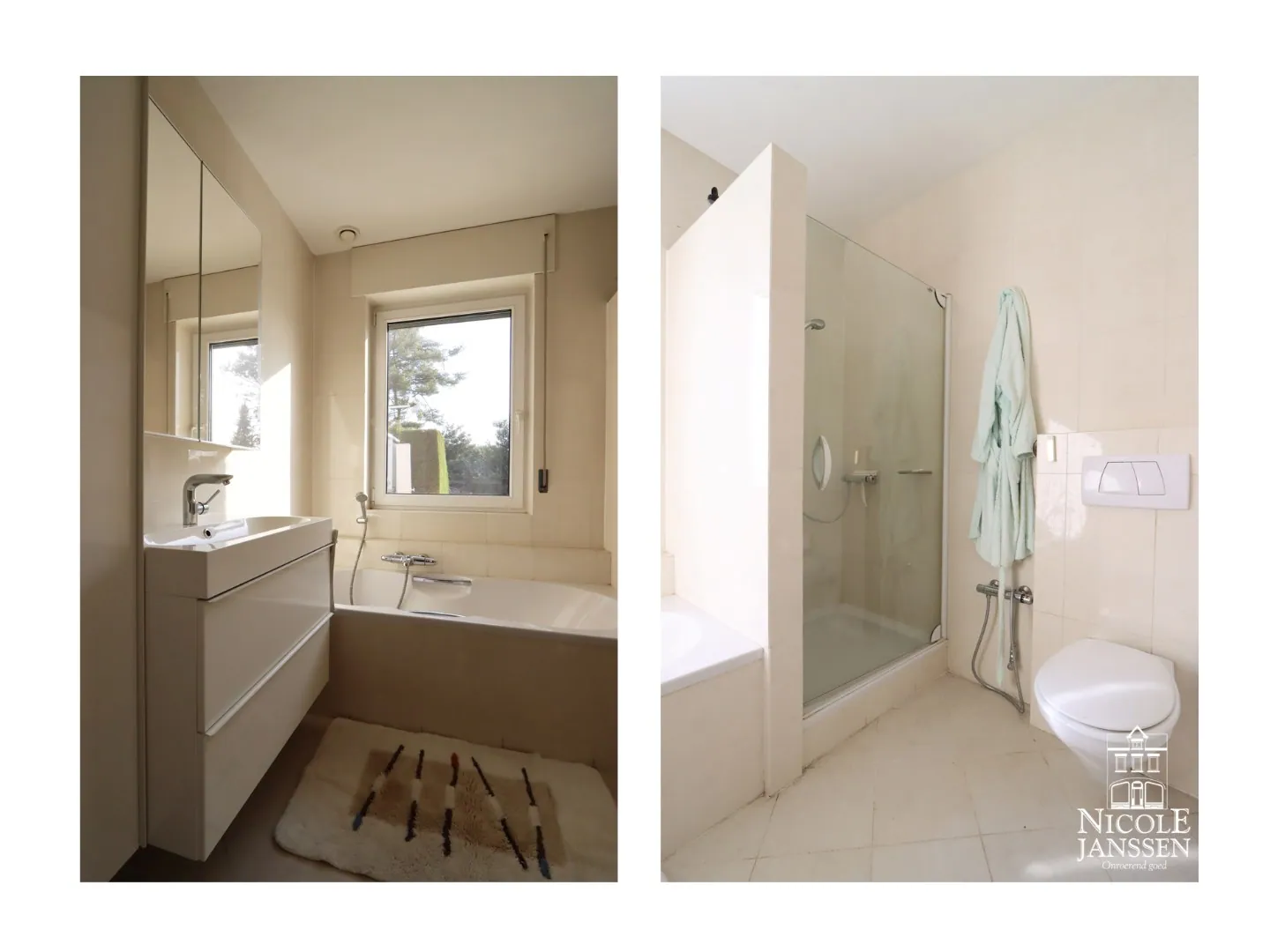 - Volledig betegelde badkamer met ligbad, douche, toilet en wastafel in fraai badkamermeubel