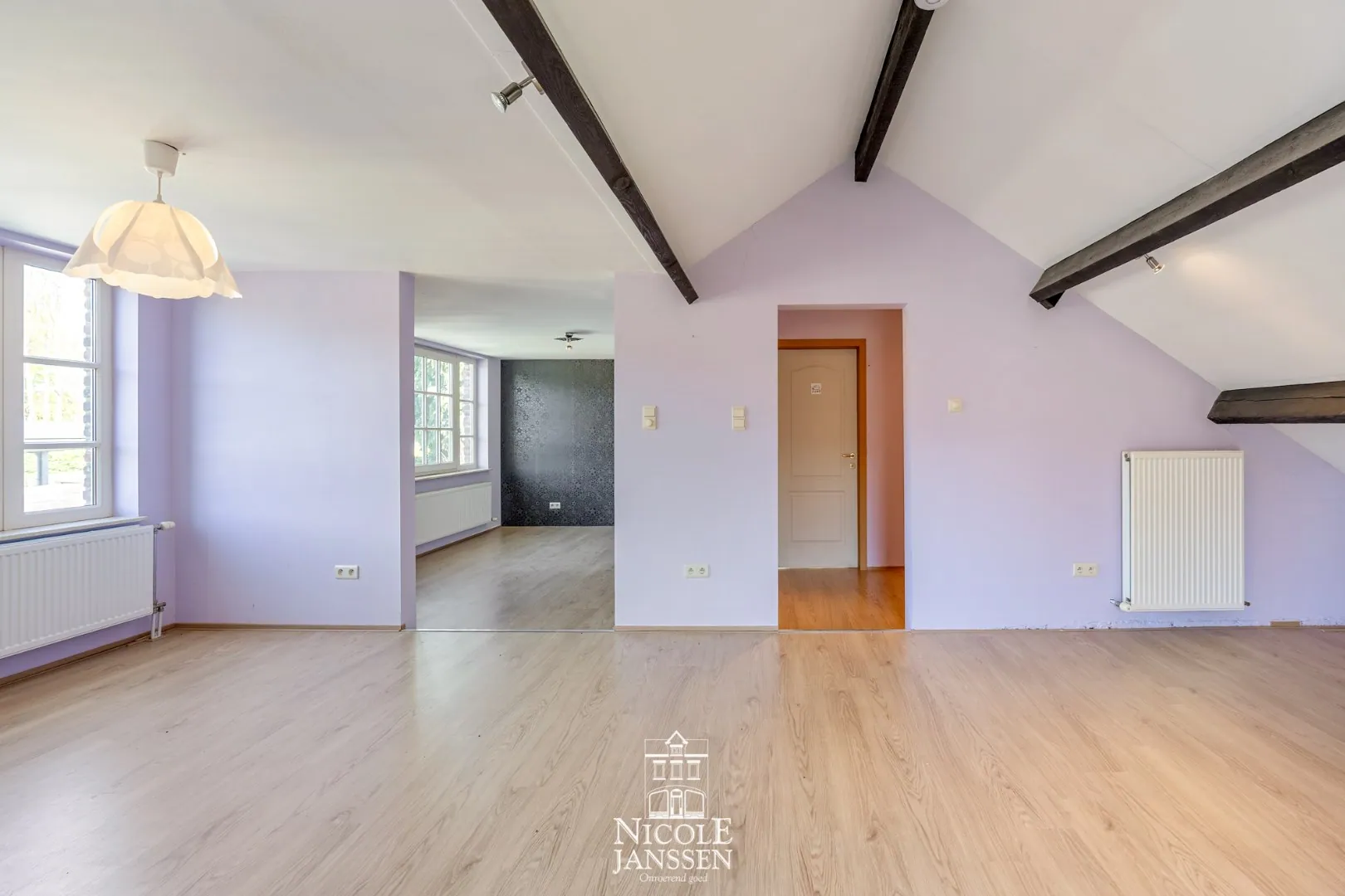 - Open leefruimte met houten balken structuur en inbouw houtkachel