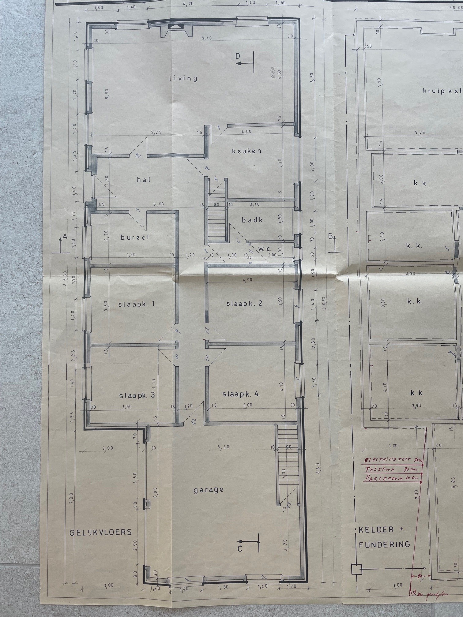 - Gelijkvloers: inkomhal, gastentoilet, woonkamer, keuken, bureel, twee grote slaapkamers, twee kleinere slaapkamers, badkamer, dubbele inpandige garage